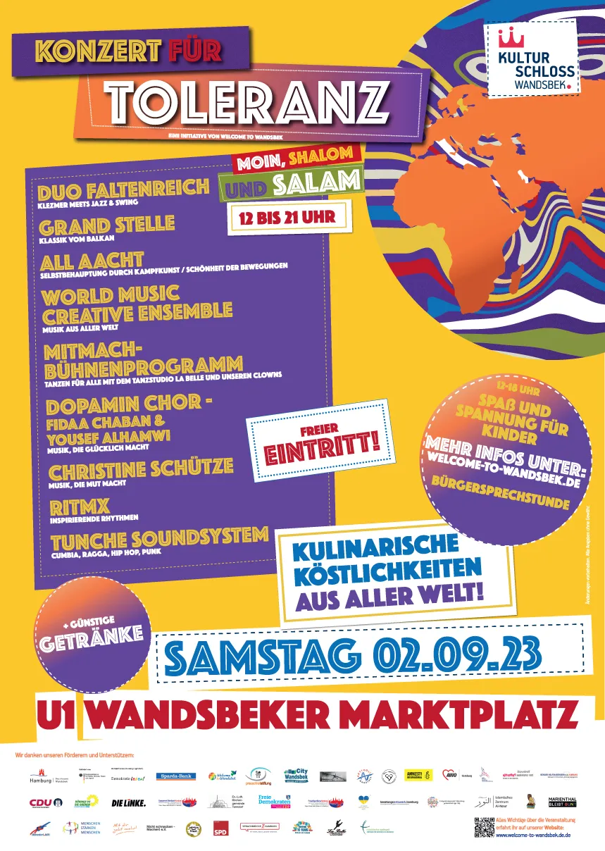 Anfang September 2023 feiert das Konzert für Toleranz zum fünften Mal die kulturelle Vielfalt auf dem Wandsbeker Marktplatz: Von 12 bis 21 Uhr erwartet die Besucher*innen ein buntes Programm aus Live-Musik, kulinarischen Köstlichkeiten aus aller Welt, Kinderschminken, Bücherverteilung und vielen weiteren Aktionen. Präsentiert von „Welcome to Wandsbek“ und dem Kulturschloss Wandsbek.