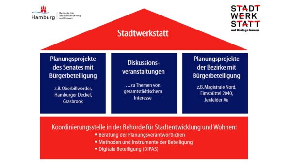 Seit 2012 ist die Stadtwerkstatt die Stabsstelle für Bürgerbeteiligung und die Plattform für Information und Bürgerbeteiligung bei Hamburger Planungsprojekten. Im neu aufgelegten Leitfaden „Hamburg gemeinsam gestalten“ gibt sie einen Überblick über die verschiedenen Beteiligungsformate, Möglichkeiten der Mitwirkung für Bürger*innen und erläutert die Grundlagen und Zuständigkeiten. Projektbeispiele zeigen, wie es funktioniert.