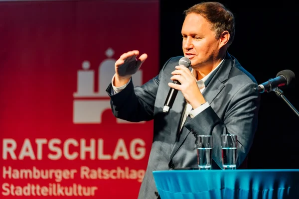 Senator Dr. Carsten Brosda auf dem Ratschlag 2025: „Der Dreiklang des diesjährigen Ratschlags Stadtteilkultur ‚WERTE, WIRKUNG, WANDEL.‘ trifft den Kern der aktuellen Probleme: Darauf zu beharren, in der sonst sehr praxisorientierten Soziokultur mit den zugrunde liegenden Werten zu beginnen und nicht mit der Empirie, ist bemerkenswert. Als Kultursenator weise ich jedes Jahr dringlicher auf das Gleiche hin. Und während es mit der Bearbeitung bestimmter Themen einfach nicht vorangeht, verschiebt sich der gesellschaftliche Fokus zusehends auf die Ratlosigkeit angesichts all der Probleme.