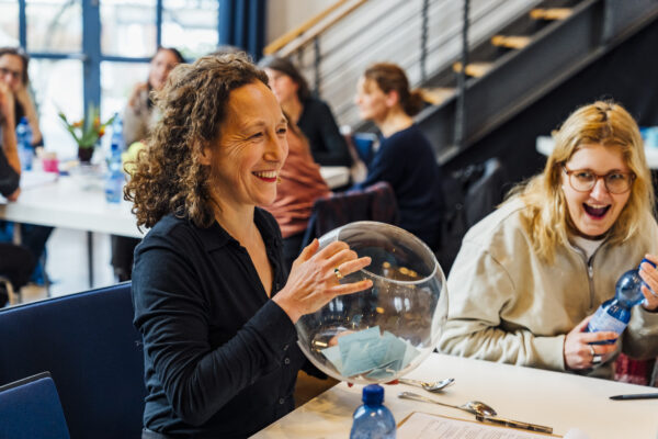 Schnell finden sich die Teilnehmenden in Kleingruppen zusammen. Nach kurzen Kennenlernrunden werden methodische Lösungsansätze für Herausforderungen in der eigenen Arbeit oder im Wirkungsfeld des Stadtteils erarbeitet. Zwischendurch bringen die Tischgruppen mit Gemüsesaft-Shots einen Toast auf Wirksamkeit und Verbundenheit aus oder werfen Tennisbälle als schlagende Argumente für die Demokratie auf einen Pappaufsteller.