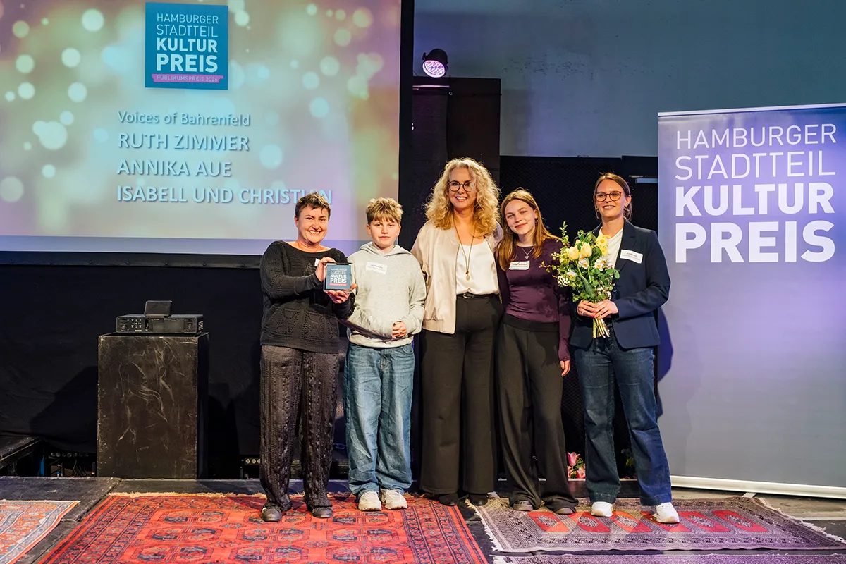 Zum dritten Mal wurde in diesem Jahr der Publikumspreis der Hamburger Stadtteilkultur vergeben, der mit 2.000 Euro dotiert ist. Über einen Zeitraum von drei Wochen hatte die Öffentlichkeit die Möglichkeit, online für eines der zehn Finalist*innen-Projekte abzustimmen. Der Preis wurde im Rahmen der Verleihung von der Geschäftsführerin von STADTKULTUR HAMBURG, Corinne Eichner, an die Kulturagent*innen Hamburg überreicht. Das Projekt „Voices of Bahrenfeld“ ermöglichte rund 500 Schüler*innen der Esther-Bejarano-Schule, ihren Stadtteil im Rahmen eines Audio-Walks neu zu erzählen.